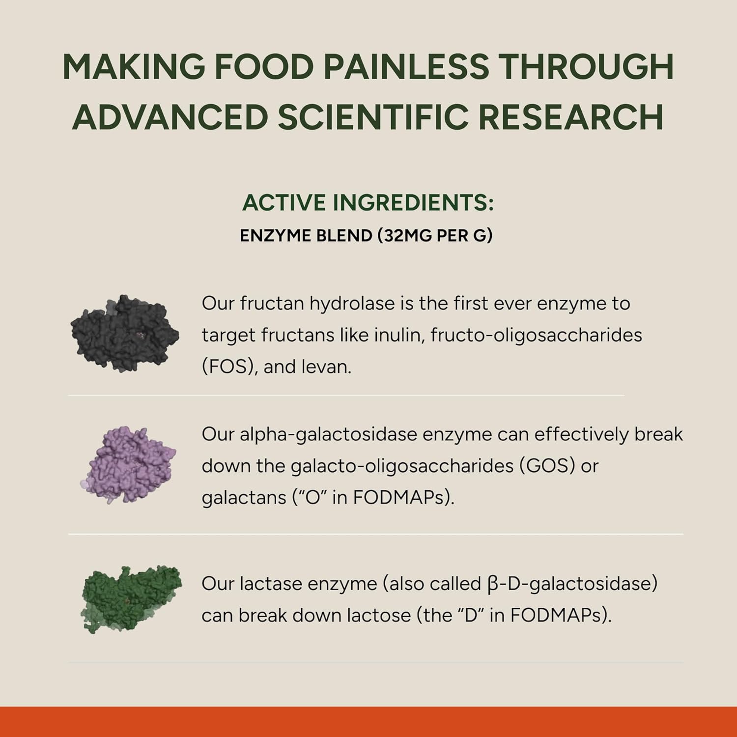 FODZYME®is a tasteless enzyme powder designed to break down FODMAPs (fructan, GOS, and lactose) in food to make meals more digestible. It's formulated specifically for people with FODMAP sensitivities.