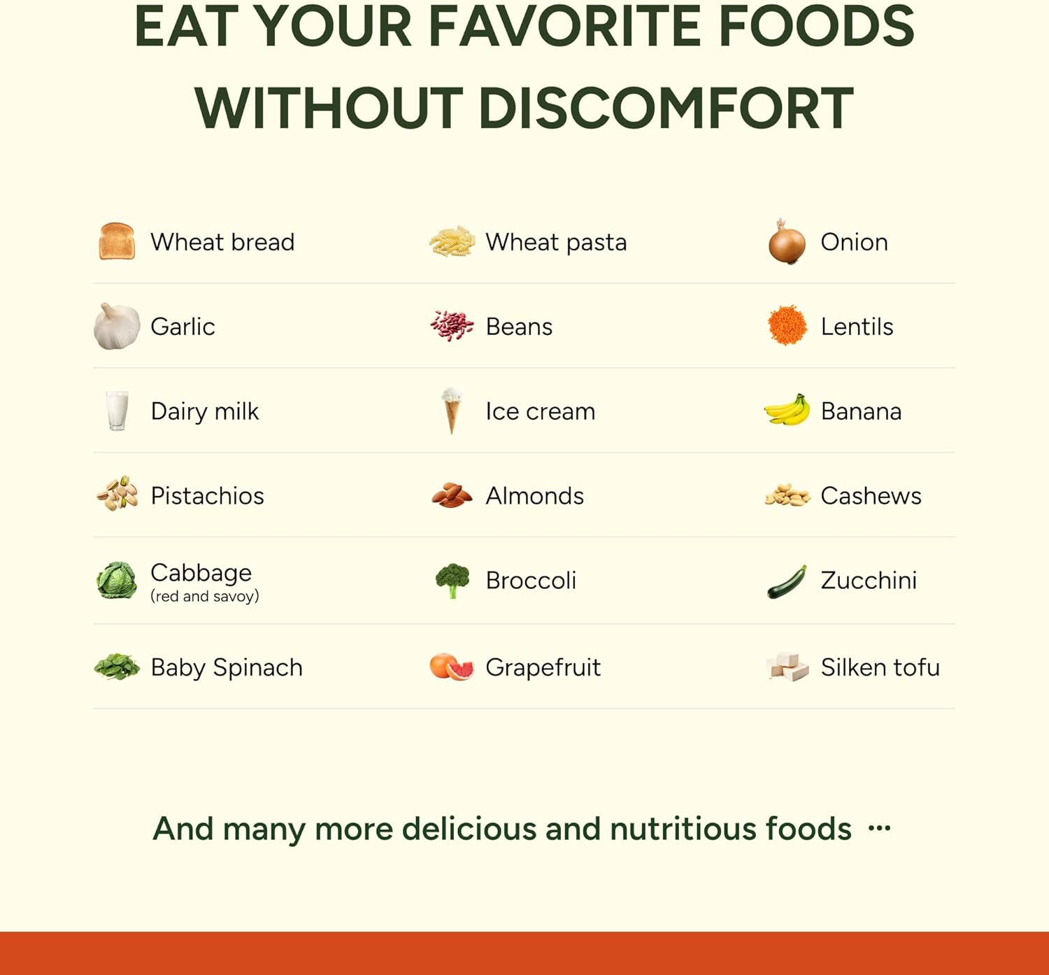 Alpha-galactosidase:Targets GOS (galacto-oligosaccharides) present in beans and legumes, aiding digestion.